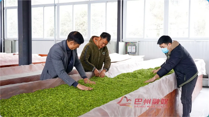 每天清晨,新鲜采摘的茶芽会被迅速送往“浙川东西部协作义乌-巴州灵山云雾茶厂”。车间里茶香弥漫,工人们正忙着将鲜叶均匀地摊晾开来,一片繁忙景象。