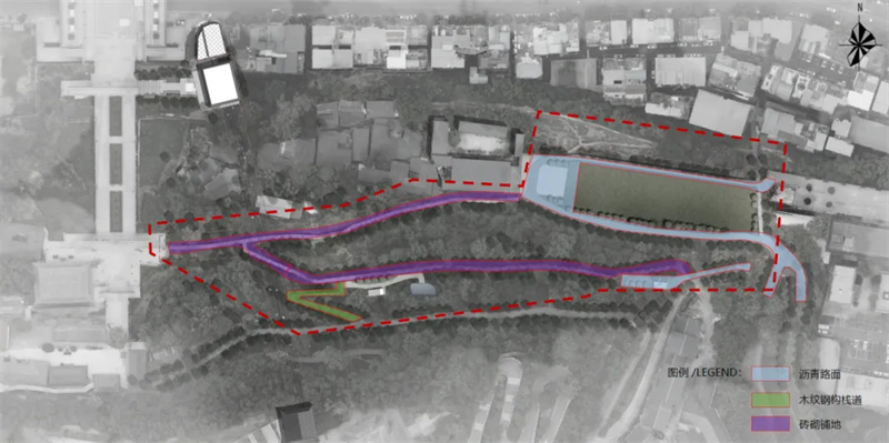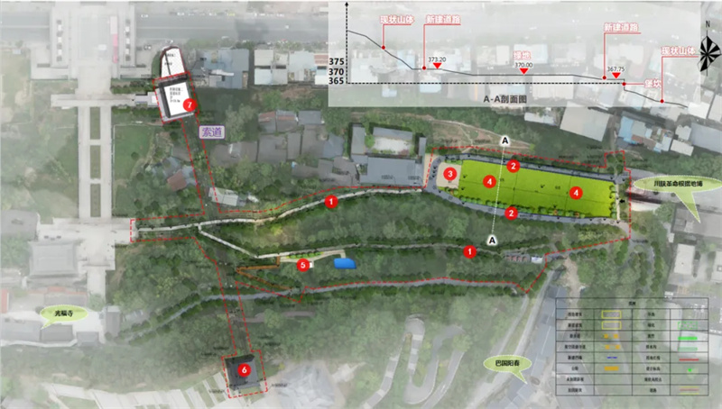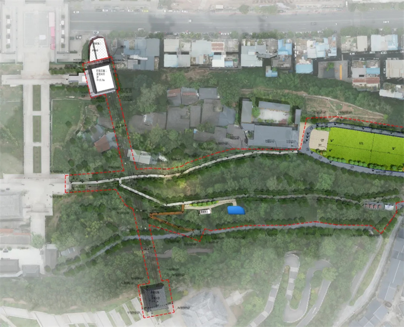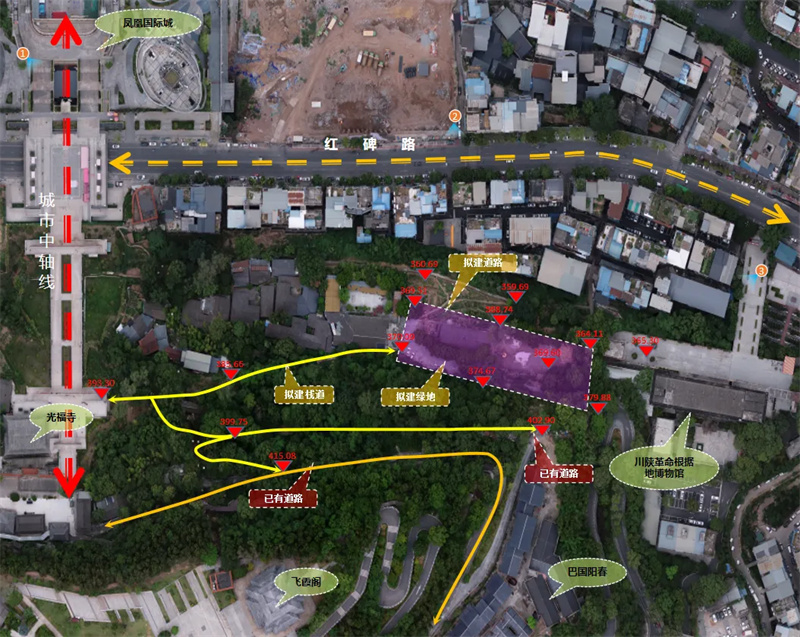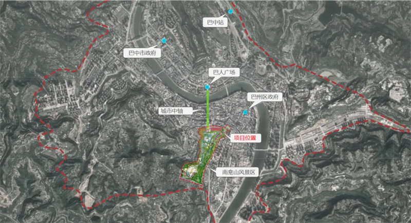 项目用地地处巴州区江南片区,属南龛山北坡,与红碑路相接。项目新建区域位于川陕革命根据地博物馆与城市中轴线南龛坡巴诗福梯之间,是连接川陕革命根据地博物馆和南龛坡光福寺的重要节点。