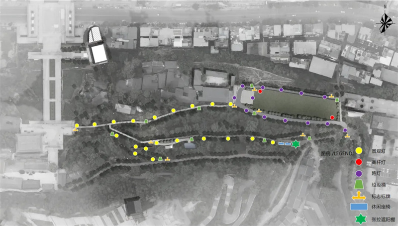 1.游步道(宽度2.2m,总长度486m);2.观光车道;3.观光车临时停靠区;4.绿地;5.景观亭(18.63㎡);6.上站房;7.下站房。
