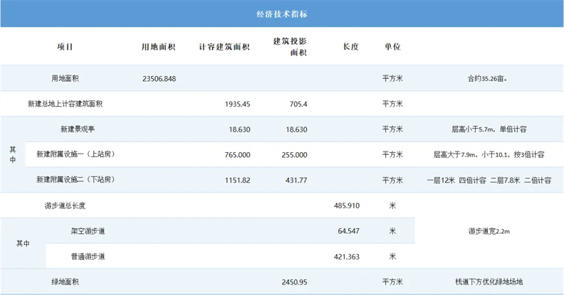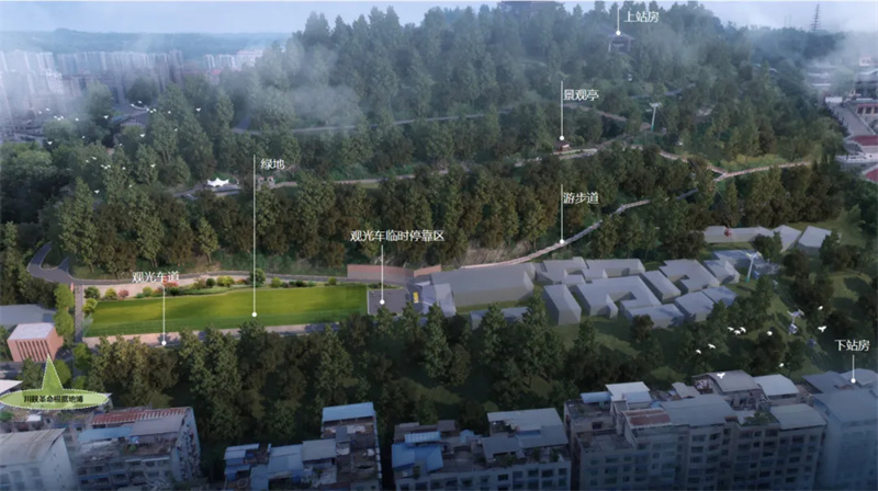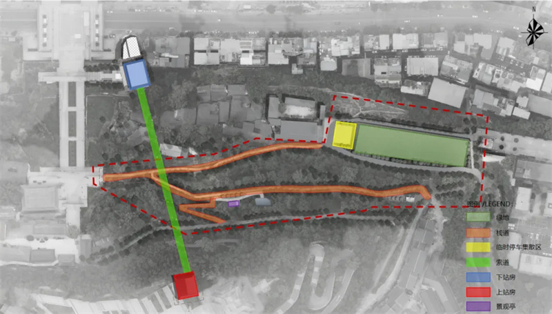 1.游步道(宽度2.2m,总长度486m);2.观光车道;3.观光车临时停靠区;4.景观亭(18.63㎡);5.上下站房。