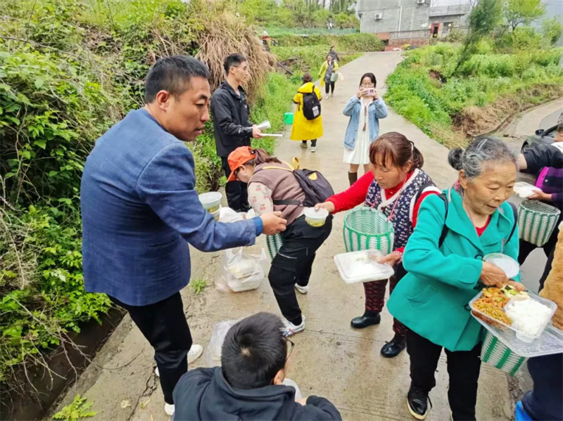 雨越下越密,山间雾气弥漫。就在这紧张又疲惫的时刻,几辆沾满泥浆的汽车缓缓驶进了茶园小路。天马山镇党委、政府的党员干部们来了!他们冒着雨,将车后备箱里摞得整整齐齐的300余份爱心盒饭,小心翼翼地端下来。