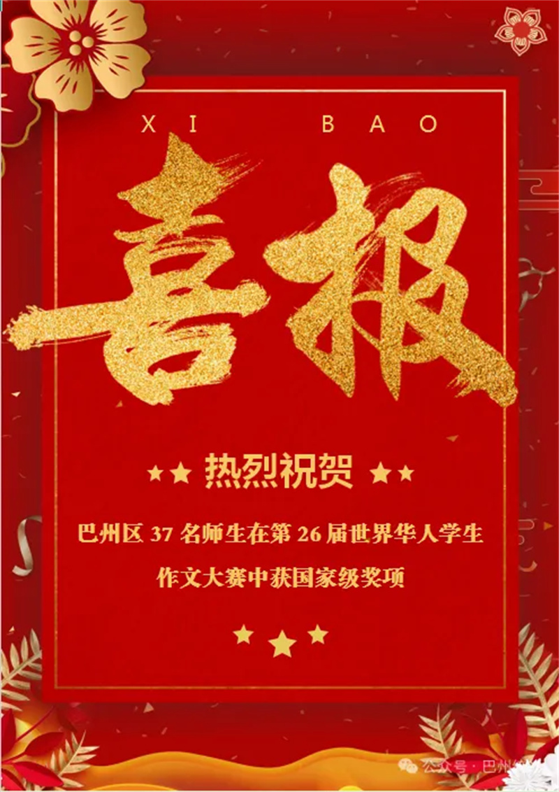 笔墨展风华,青春著华章!近日,由中国侨联、全国台联主办的第二十六届世界华人学生作文大赛获奖结果正式揭晓。巴州区共有28名学子凭借扎实的文字功底和真挚的情感表达斩获殊荣,用笔墨书写青春风采,传递中华文脉。其中,全国一等奖2名、二等奖10名、三等奖16名;;另有9名教师荣获优秀指导教师奖。