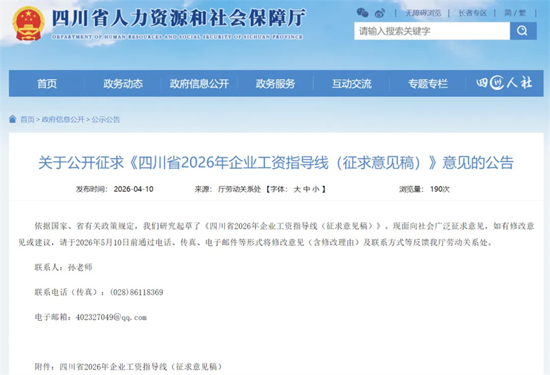 近日,四川省人力资源和社会保障厅发布《四川省2026年企业工资指导线(征求意见稿)》(以下简称《征求意见稿》)面向社会广泛征求意见。