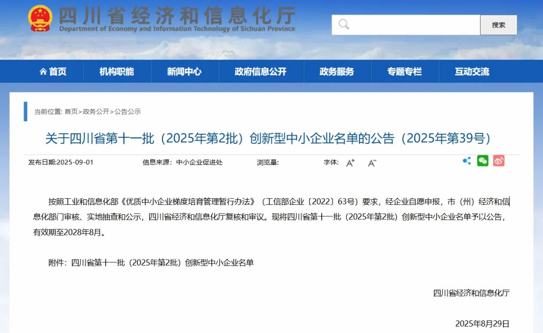 近日,四川省经济和信息化厅公布了四川省第十一批(2025年第2批)创新型中小企业名单,1071家企业上榜,有效期至2028年8月。