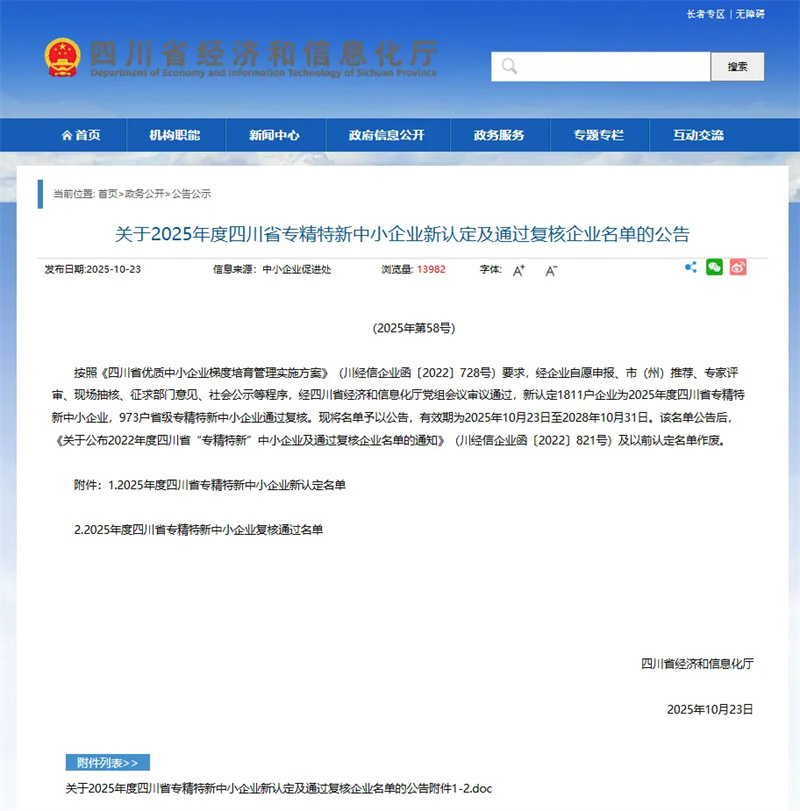《关于2025年度四川省专精特新中小企业新认定及通过复核企业名单的公告》