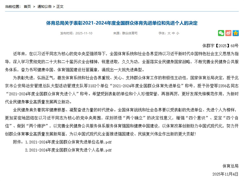 《体育总局关于表彰2021-2024年度全国群众体育先进单位和先进个人的决定》