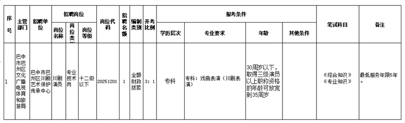 本次招聘川剧演员1名。具体岗位和条件见《巴中市巴州区川剧艺术保护传承中心2025年下半年公开考试招聘工作人员岗位表》(附件1)。