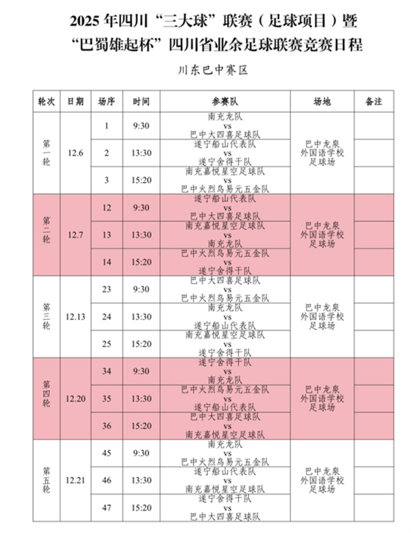 “为争取赛事落地巴州,我们积极对接,提前进行场地升级、搭建赛事保障体系。此次比赛严格落实市委足球高质量发展专题会、区委区政府相关会议精神,从场地布置到赛程协调,我们力争每个环节都体现巴中承办省级赛事的专业与热情。”巴州区文广体旅局副局长李佳奇介绍道,“今天起,每周六周日,巴中龙泉外国语学校足球场就是川东足球的‘周末战场’——配合赛程,从本周起至12月底,每周六下午在南龛景区飞霞阁广场还安排了乐队演出,让球迷看完球能接着‘耍巴州’。”