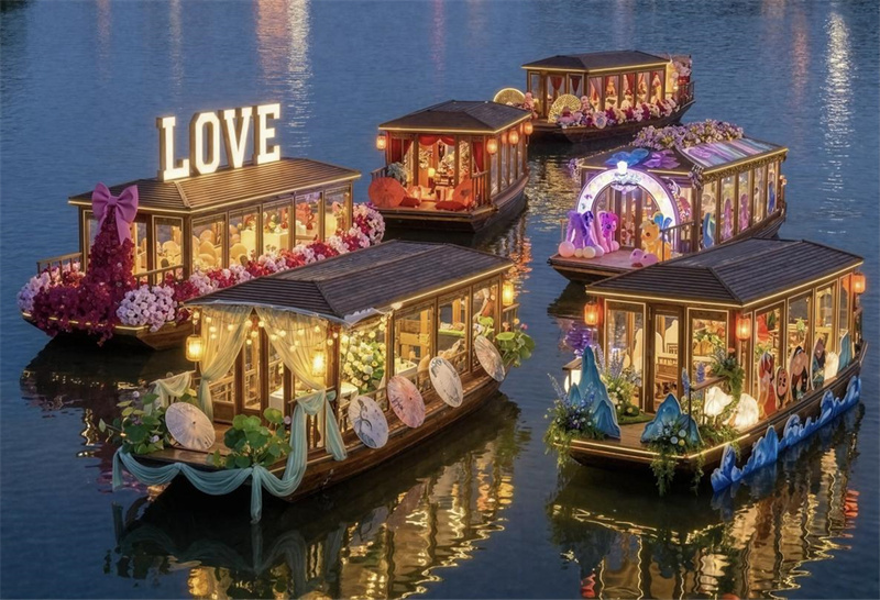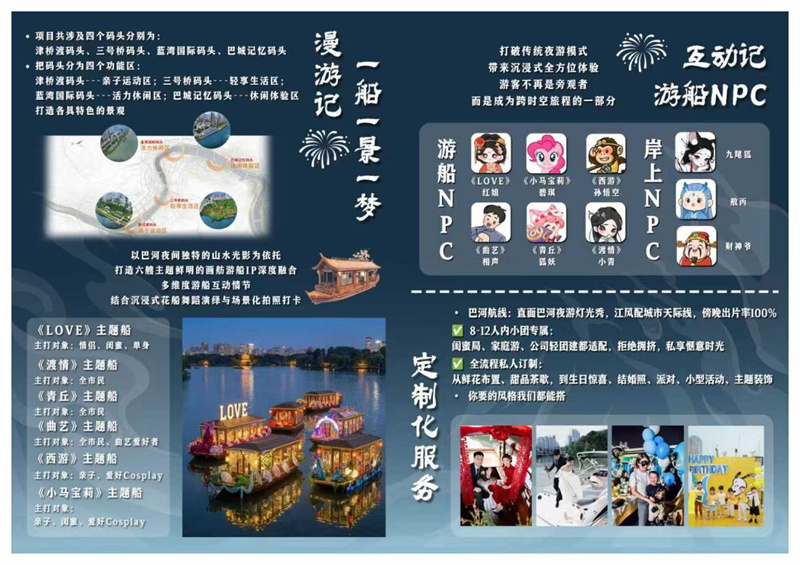 此次升级的亮点,莫过于6艘精心打造的IP主题画舫。每艘画舫都以经典文化或温情情感主题命名,配备专属NPC互动,打破传统游览模式,让游客从“旁观者”转变为“剧中人”。据悉,每艘画舫可承载24人,航程约40分钟,全程配有专业船长与安全员,确保游览安全无忧。
