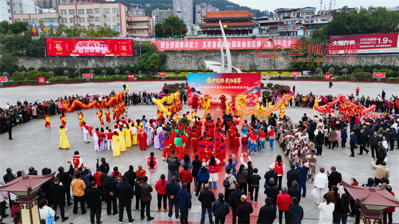 山下同样热闹。在巴人广场,一场盛大的民俗巡游正在上演。金龙翻腾飞舞、雄狮欢腾跳跃,清脆悦耳的翻山铰子敲打出巴山儿女的豪迈,精彩绝伦的川剧变脸引得阵阵惊呼,铿锵有力的锣鼓声与灵动活泼的表演相映成趣,吸引了大批市民驻足观赏,不少人更是情不自禁跟随巡游队伍一路前行,汇成一条流动的欢乐长河。