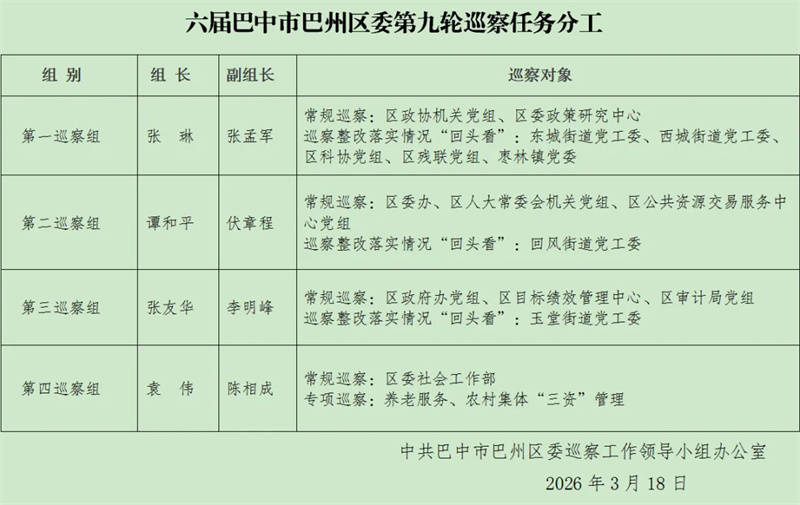 按照区委统一部署,2026年3月中旬至7月上旬,区委将派出4个巡察组,对区委办等9个单位党组织开展常规巡察;对养老服务和农村集体“三资”管理开展专项巡察;对东城街道等7个单位党组织开展巡察整改落实情况“回头看”。