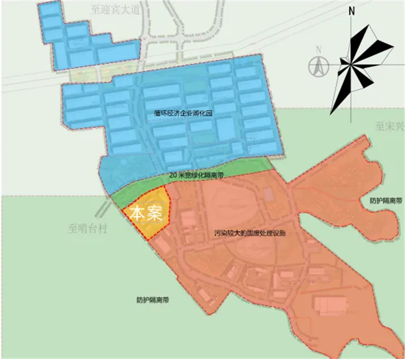 巴中市循环经济产业园位于中心城区和光辉镇常年主导风下风向。根据固废处理设施污染大小,规划上将北侧布置循环经济企业孵化园,南侧布置固废处理设施。本次项目处于绿化隔离带南侧污染较大的固废设施区域。