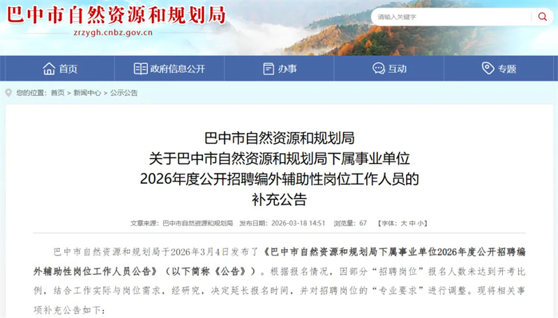 3月18日,巴中市自然资源和规划局网站发布关于巴中市自然资源和规划局下属事业单位2026年度公开招聘编外辅助性岗位工作人员的补充公告,详情如下: