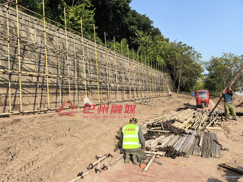 12月10日,巴河城区段三号桥码头建设现场一派繁忙景象,数十名工人正紧张有序地推进挡墙处理、沙石清理及脚手架搭设作业,为后续独具特色的主题彩绘施工做足充分准备。
