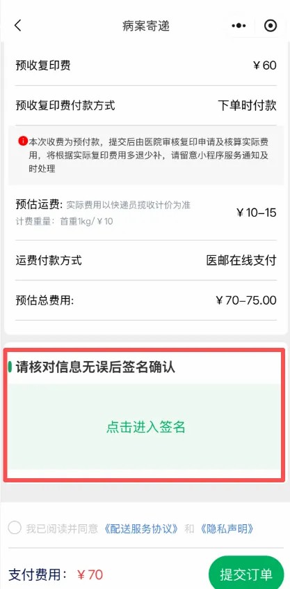 选择病案寄递模块,按照提示上传身份证件、填写身份信息与住院信息和邮寄信息、签字确认。