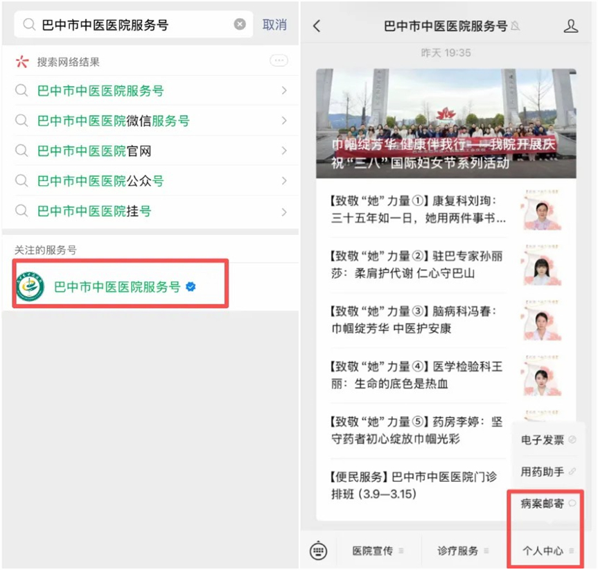 微信公众号关注“巴中市中医医院服务号”,点击“个人中心”中的“病案邮寄”并识别弹出二维码(或搜索“中国邮政医邮达”小程序)。